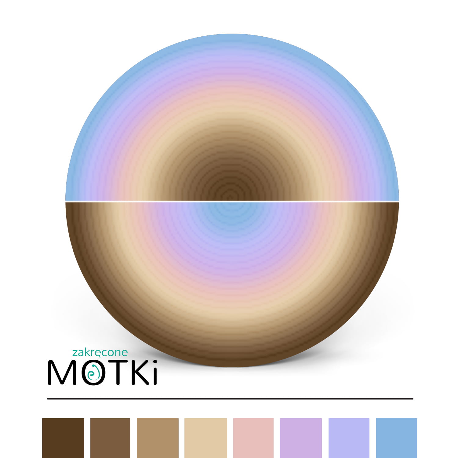 Księżycowy Miś to motek ombre, który łączy przytulność ziemistych tonów z chłodnym urokiem pastelowych barw. Brąz, orzech i glina stopniowo ustępują miejsca ciepłemu beżowi, by następnie przejść w pąsowy róż, jasny fiolet, krokus i zakończyć się błękitem. Ta paleta przywodzi na myśl miękką, wieczorną atmosferę – ciepło ukochanego misia i chłodną ciszę księżycowej nocy.
