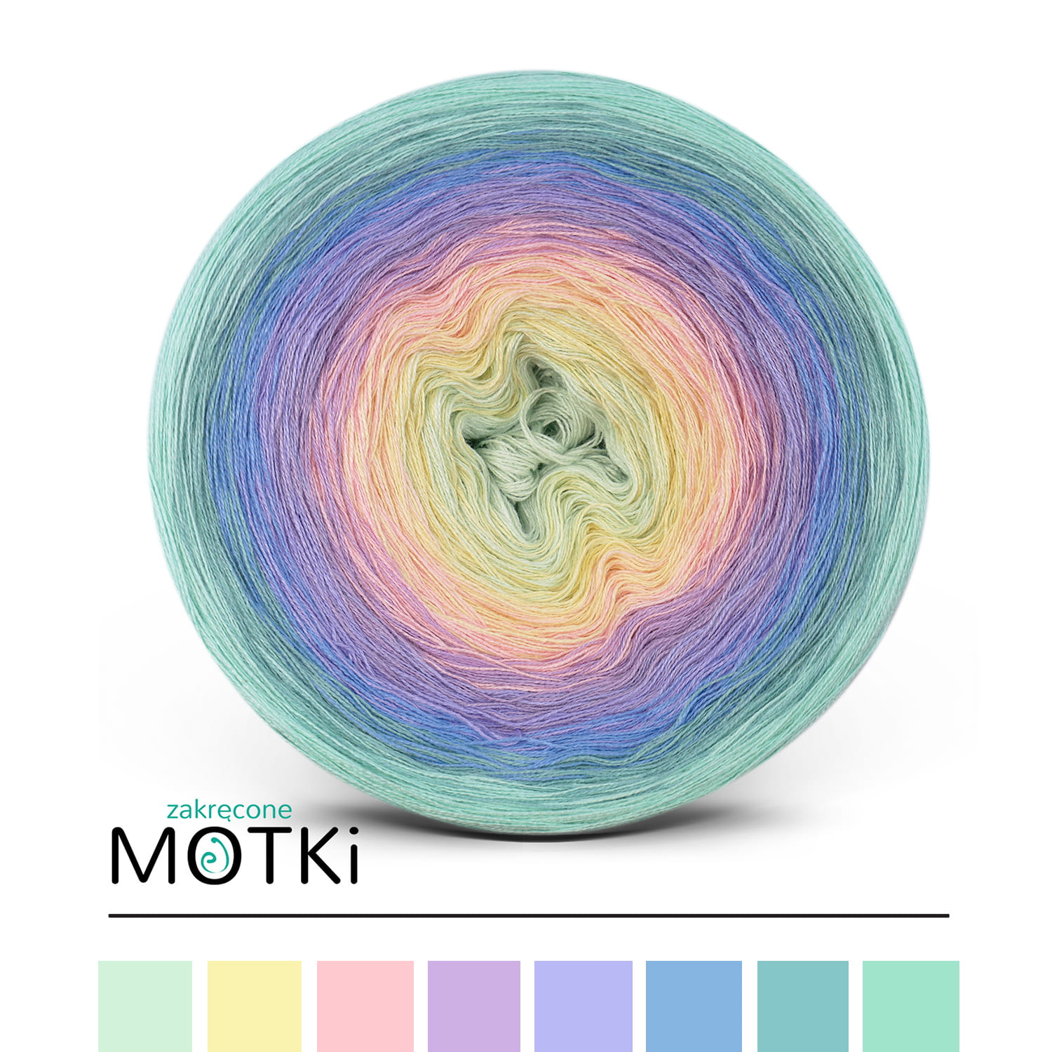 Pistacjowy Jednorożec to motek w wyjątkowo świeżej, lekkiej palecie barw, która łączy pastelową słodycz z nutą zielonej energii. Jasna pistacja i żółty przechodzą płynnie w delikatny róż i fiolet, tworząc bajkowy nastrój, który dopełniają chłodne tony krokusa, błękitu i patyny. Całość kończy się głębszą pistacją, nadając kompozycji harmonii i miękkiego kontrastu. To idealny wybór dla projektów, które mają być radosne, a jednocześnie stonowane.