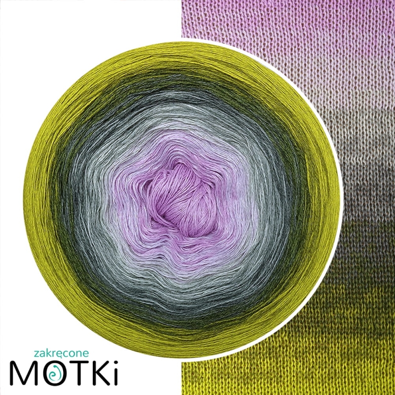 Fiołkowe Tchnienie to motek, który łączy w sobie delikatność fiołkowych odcieni i naturalną głębię oliwkowej zieleni. Płynne przejścia kolorystyczne rozpoczynają się od subtelnej lilii i lawendy, przypominających kwitnące pola fiołków, przechodzą przez eleganckie szarości, aż po wyraziste nuty ciemnej oliwki i świeżość limonki, które oddają energię budzącej się natury.