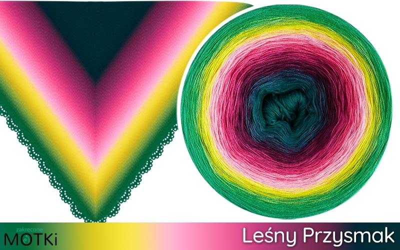 Leśny Przysmak to wyjątkowy motek, który zachwyca bogactwem barw inspirowanych owocami leśnymi, dojrzałym latem i głębią zieleni. W jednym motku znajdziesz aż 13 kolorów: navy, petrol, ciemna jeżyna, jeżyna, fuksja, jasna fuksja, magneta, landrynkowy róż, słoneczny żółty, limetka, zielony, jodła, absynt. To intensywna, pełna życia kompozycja, która świetnie sprawdzi się w projektach o charakterze energetycznym, radosnym i kolorowym.