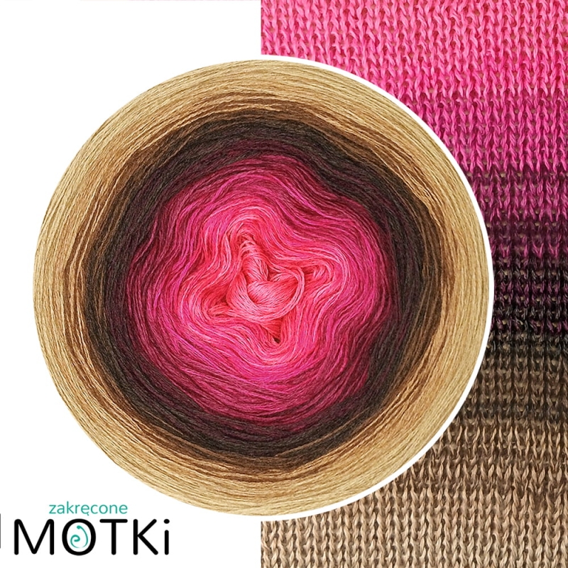 Malinowe Brownie to włóczka, która łączy słodycz malinowego różu z głębią czekoladowych brązów, tworząc harmonijny gradient przypominający ulubiony deser. Kolory rozpoczynają się od jasnej gumy balonowej i intensywnego hot pink, przechodząc przez soczystą jeżynę i głębokie wino, by zakończyć się ciepłymi tonami czekolady, toffi i ciemnego brązu. To połączenie idealne na projekty pełne ciepła i wyrazistej elegancji.