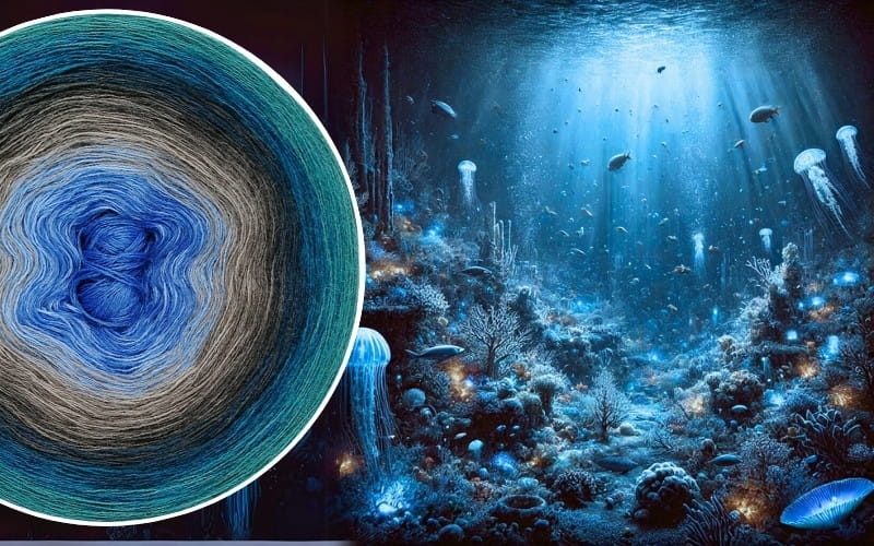 (8) Mroźne Głębie - Włóczka Ombre - Merino/akryl: chaber/ błękit/ średni szary/ szary/ ciemny szary/ petrol/ navy/ morski