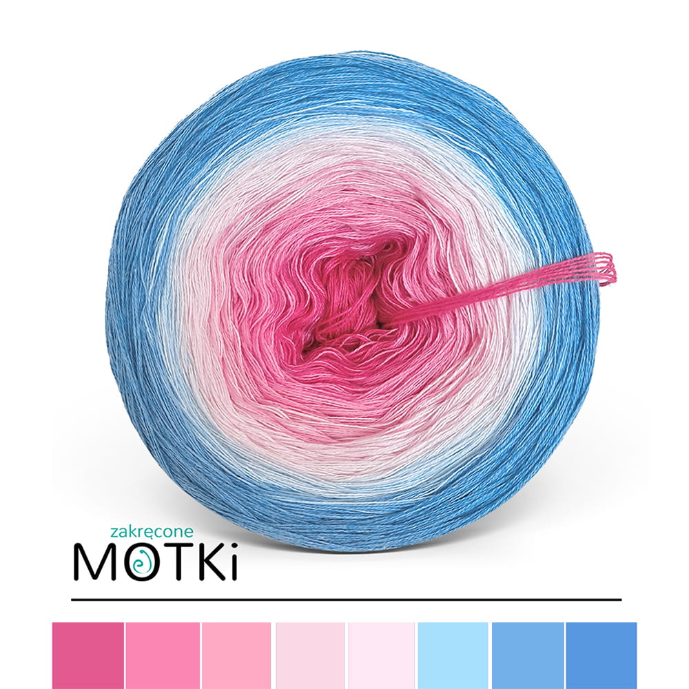 Oferujemy motek ombre z włóczki bawełniano-akrylowej, zakręcony z ośmiu zachwycających kolorów inspirowanych naturą: jasna fuksja, magneta, landrynkowy róż, pastelowy róż, pudrowy róż, jasny niebieski, błękit i jeans. Te delikatnie przenikające się odcienie tworzą efektowny gradient, który nada każdemu projektowi wyjątkowego charakteru i świeżości. Dzięki bogatej palecie kolorystycznej, możesz z łatwością dopasować włóczkę do swoich twórczych pomysłów.