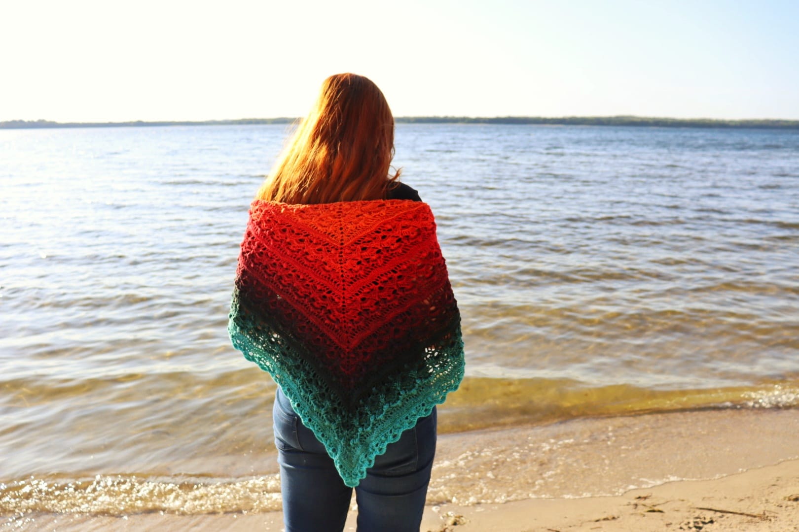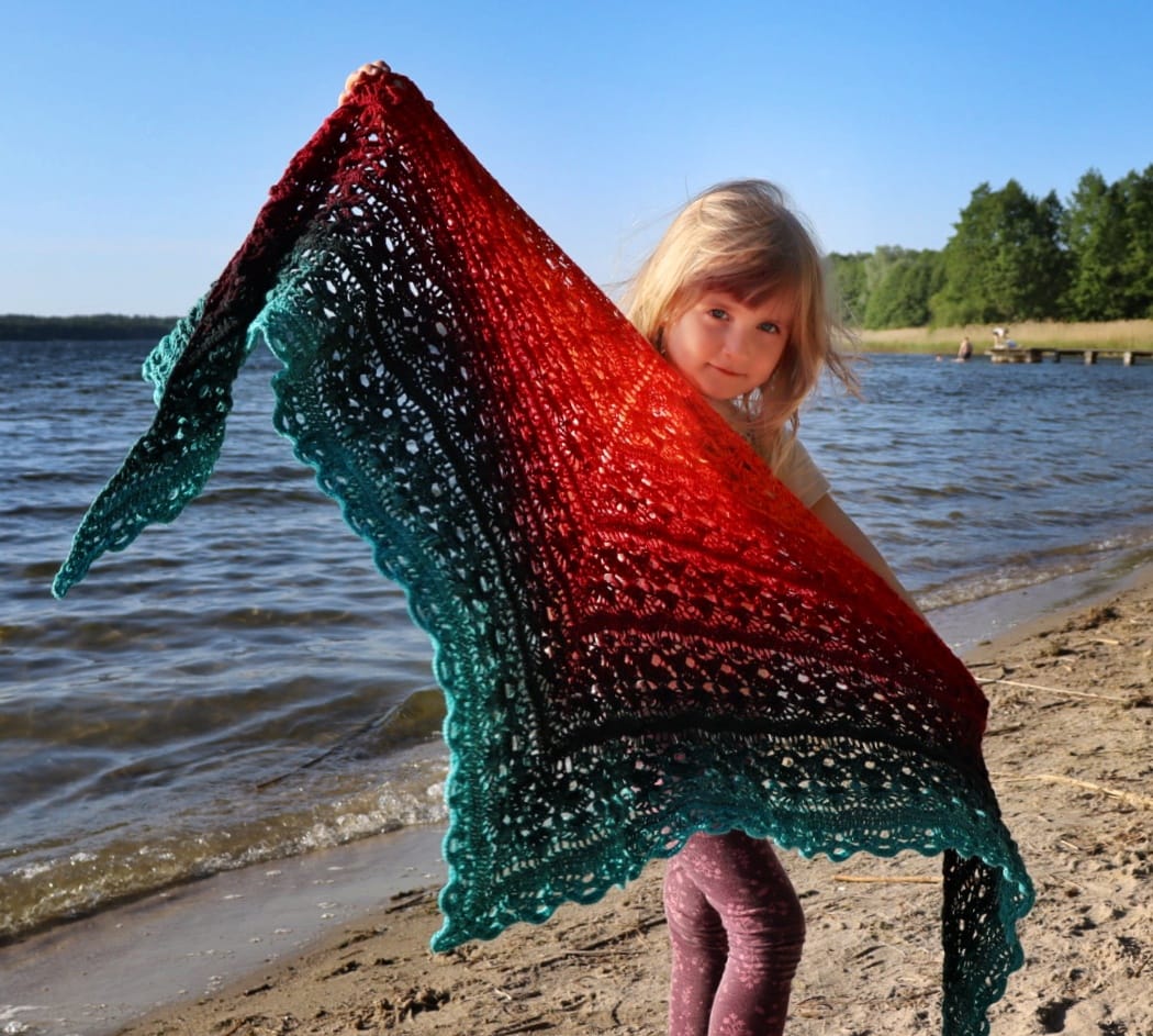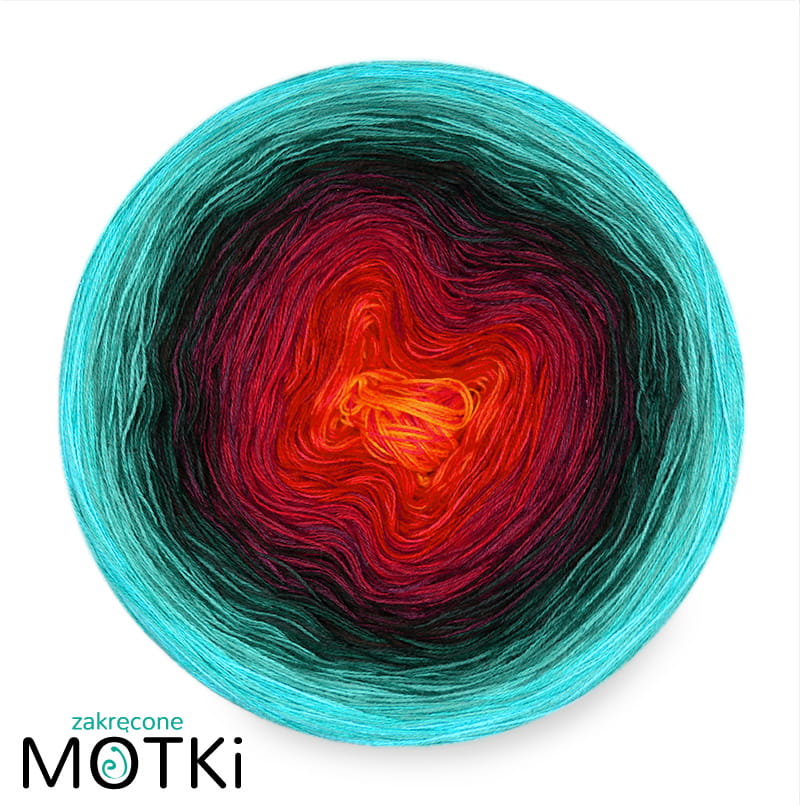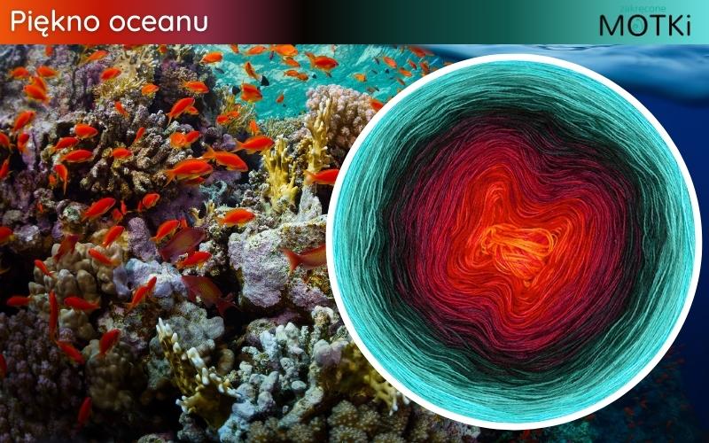 Piękno Oceanu to wyjątkowa włóczka ombre, w której ciepłe odcienie czerwieni i pomarańczy łączą się z chłodnymi tonami głębokiego oceanu. Gradient rozpoczyna się od intensywnej mandarynki i pomarańczu, przechodząc przez czerwień, burgund i malagę, aż po głębokie bordo i czekoladowy brąz. Końcowa część motka to ciemna butelkowa zieleń, morski i turkus, które przywodzą na myśl oceaniczne fale i tajemniczą głębię podwodnego świata.