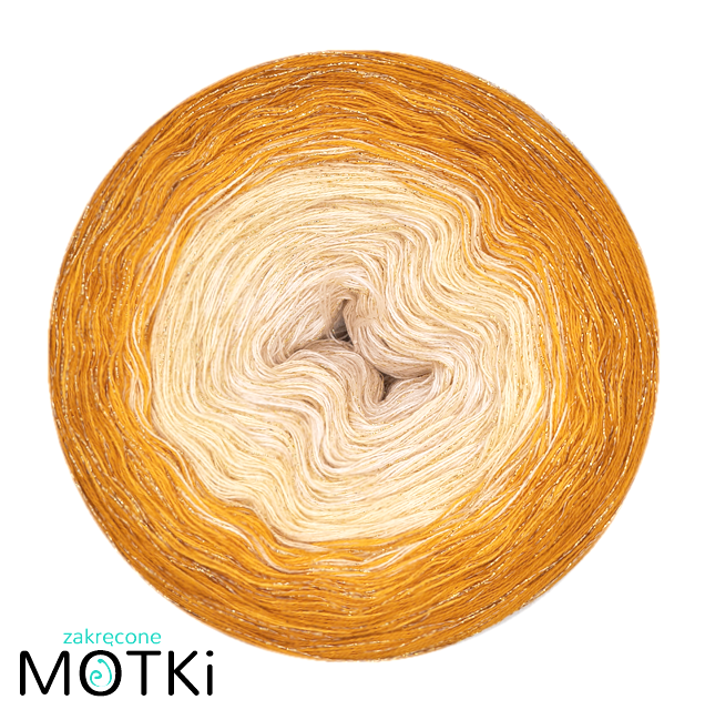 Zakręcony Motek o składzie 46,5% bawełna, 46,5% akryl, 7% lurex, zwinięty ręcznie z 2, 3 lub 4* nitek.