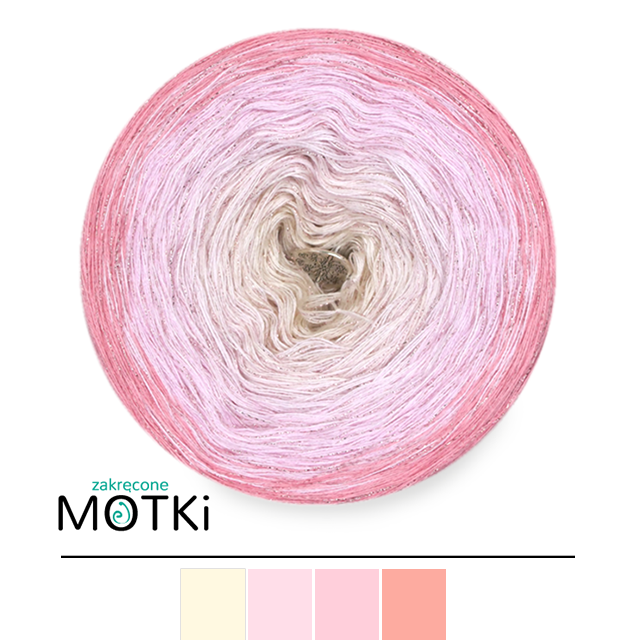Zakręcony Motek o składzie 46,5% bawełna, 46,5% akryl, 7% lurex, zwinięty ręcznie z 2, 3 lub 4* nitek.
