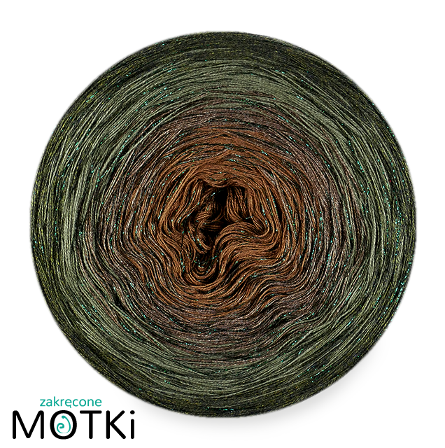 Zakręcony Motek o składzie 46,5% bawełna, 46,5% akryl, 7% lurex, zwinięty ręcznie z 2, 3 lub 4* nitek.