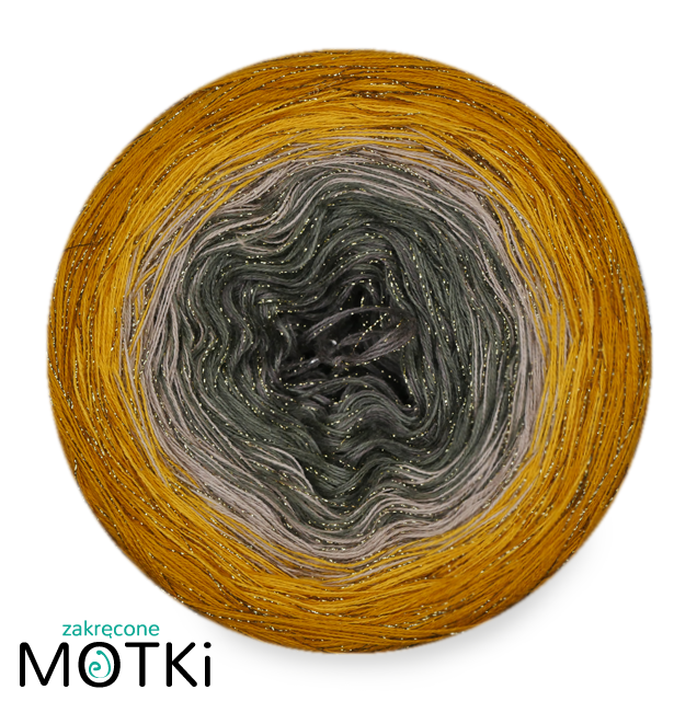 Zakręcony Motek o składzie 46,5% bawełna, 46,5% akryl, 7% lurex, zwinięty ręcznie z 2, 3 lub 4* nitek.
