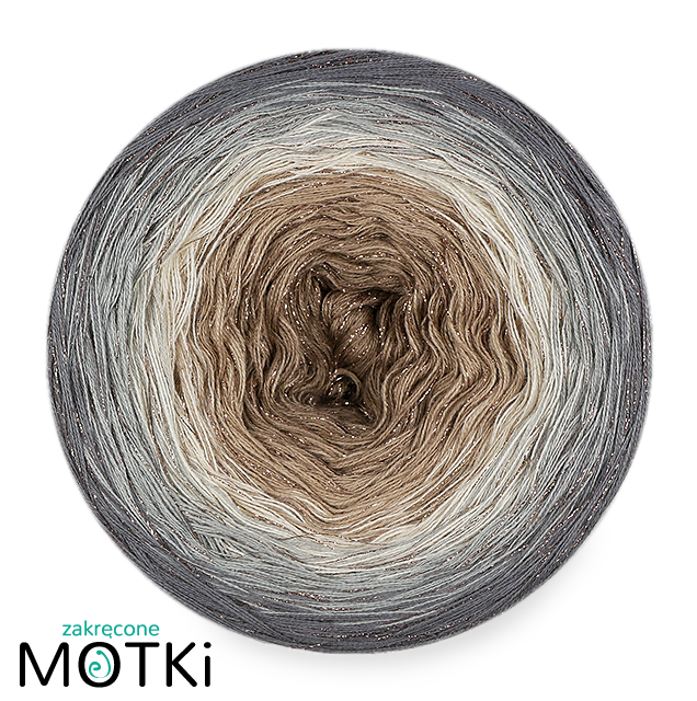 Zakręcony Motek o składzie 46,5% bawełna, 46,5% akryl, 7% lurex, zwinięty ręcznie z 2, 3 lub 4* nitek.