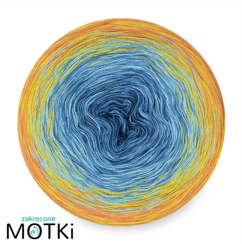 Zakręcony Motek o składzie 50% bawełna i 50% akryl, zwinięty ręcznie z 6 nitek.