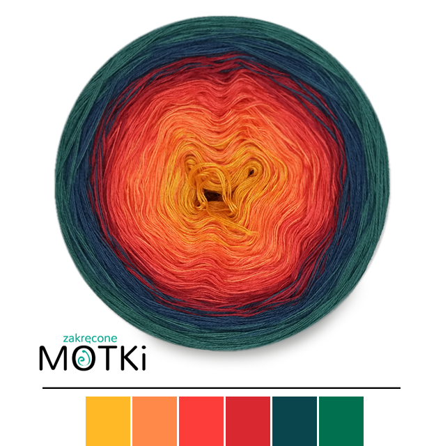 (6) Włóczka Ombre bawełna/akryl B322: kurkuma/ mango/ koral/ malaga/ petrol/ ciemny szmaragd