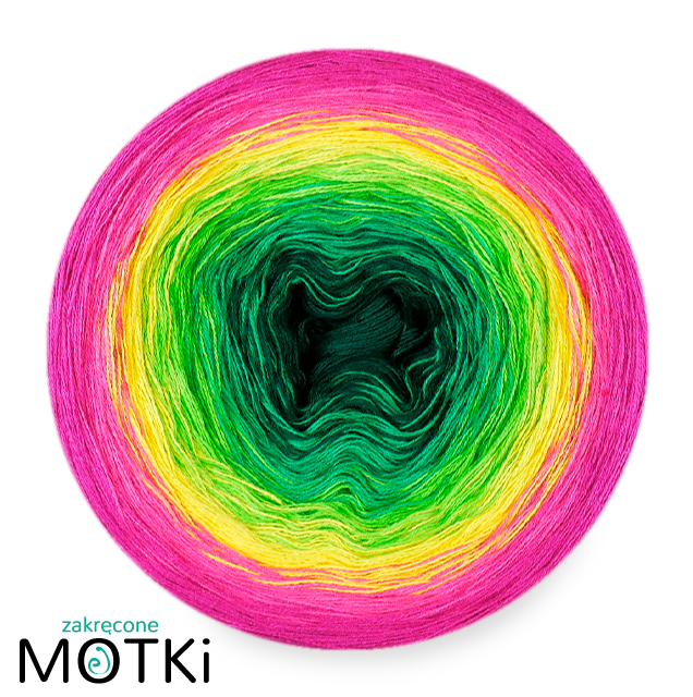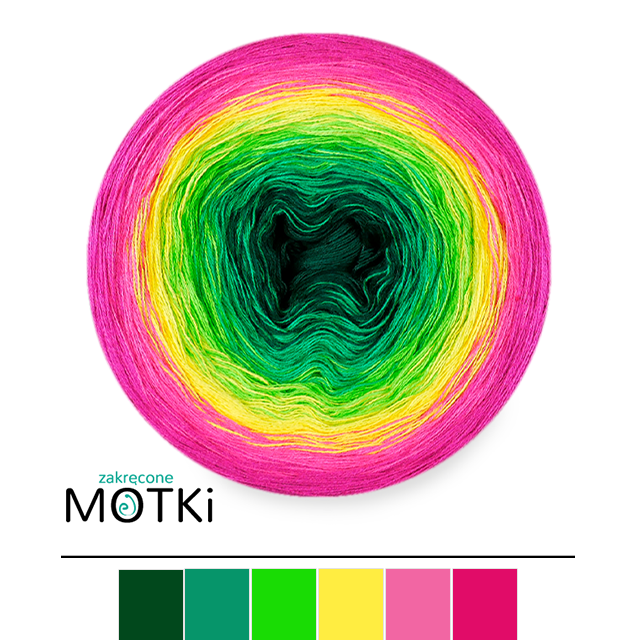 (6) Włóczka Ombre bawełna/akryl B776a: butelkowa zieleń/ absynt/ zielone jabłuszko/ słoneczny żółty/ jasna fuksja/ fuksja