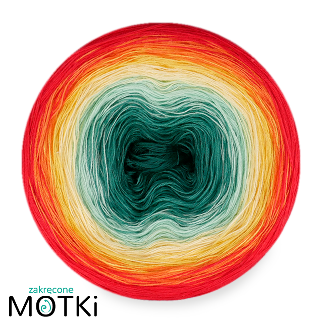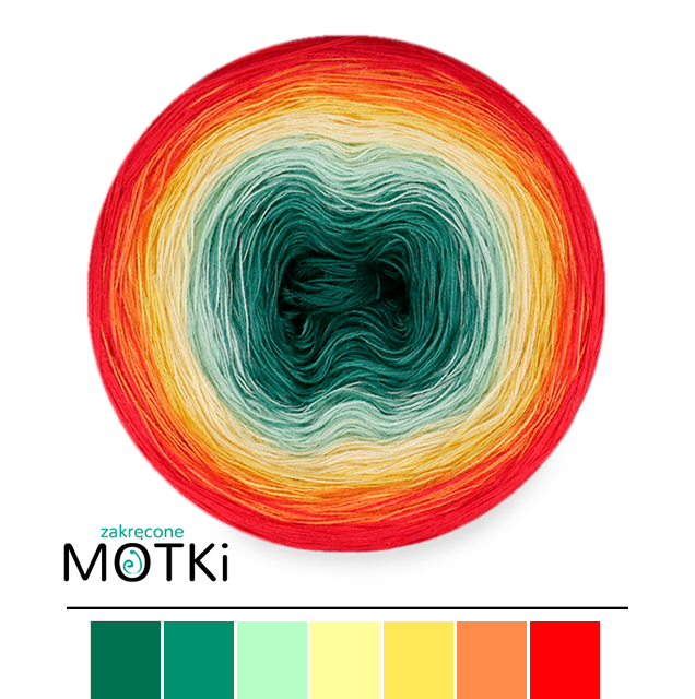 (7) Włóczka Ombre bawełna/akryl B823: ciemny szmaragd/ morski/ pistacja/ jasny żółty/ intensywny żółty/ mango/ intensywna czerwień