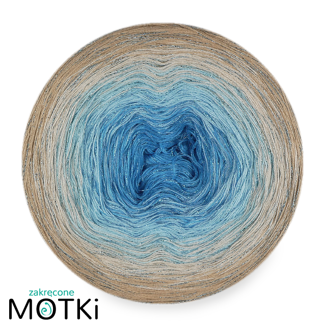 Zakręcony Motek o składzie 46,5% bawełna, 46,5% akryl, 7% lurex, zwinięty ręcznie z 2, 3 lub 4* nitek.