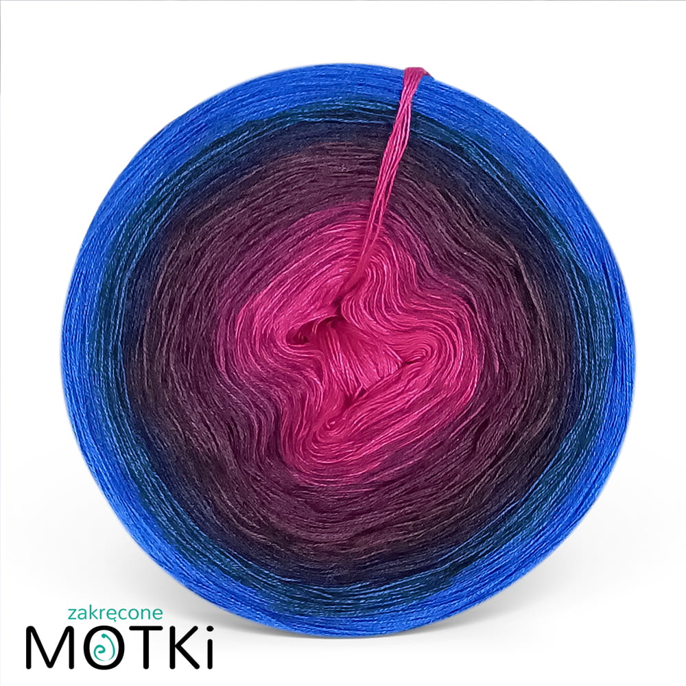 Motek Ombre Podróż w Nieznane to ręcznie kręcony produkt z włóczki bawełniano-akrylowej, dostępny w ośmiu oszałamiających kolorach, które tworzą efektowne ombre: fuksja, jeżyna, ciemna jeżyna, wino, czekolada, granat, ciemny niebieski i szafir. Te głębokie, nasycone odcienie płynnie przechodzą jeden w drugi, przyciągając wzrok i nadając projektom niepowtarzalny charakter, idealny zarówno do eleganckich akcesoriów, jak i codziennych wyrobów.