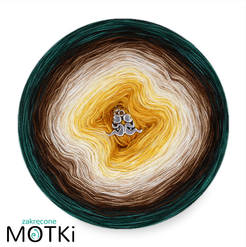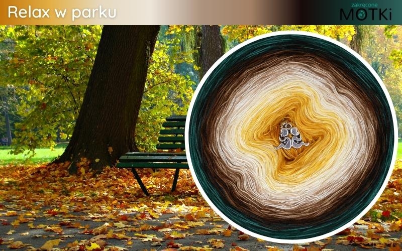 Relax w Parku to włóczka ombre, która oddaje atmosferę słonecznego dnia spędzonego w otoczeniu przyrody. Początek motka to curry, kurkuma i intensywne żółcie, które stopniowo przechodzą w ciepłe beże, glinę i brązy. Końcowe odcienie to ciemna butelkowa zieleń, butelkowa zieleń i ciemny szmaragd, oddające głębię leśnych krajobrazów.